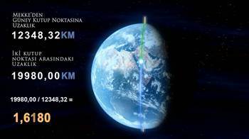 14 / 35 Kabe ile aynı koordinatlarda bulunan diğer şehirlerde de altın oran söz konusu mu? Mekke şehrinin kuzey kutup noktasına olan uzaklığı ile güney kutup noktasına olan uzaklığının oranı tam olarak 1,618 yani altın orandır. Ayrıca Mekke şehrinin Güney kutup noktasına olan uzaklığı ile iki kutup arasındaki uzaklığın birbirine oranı yine 1,618'dir.