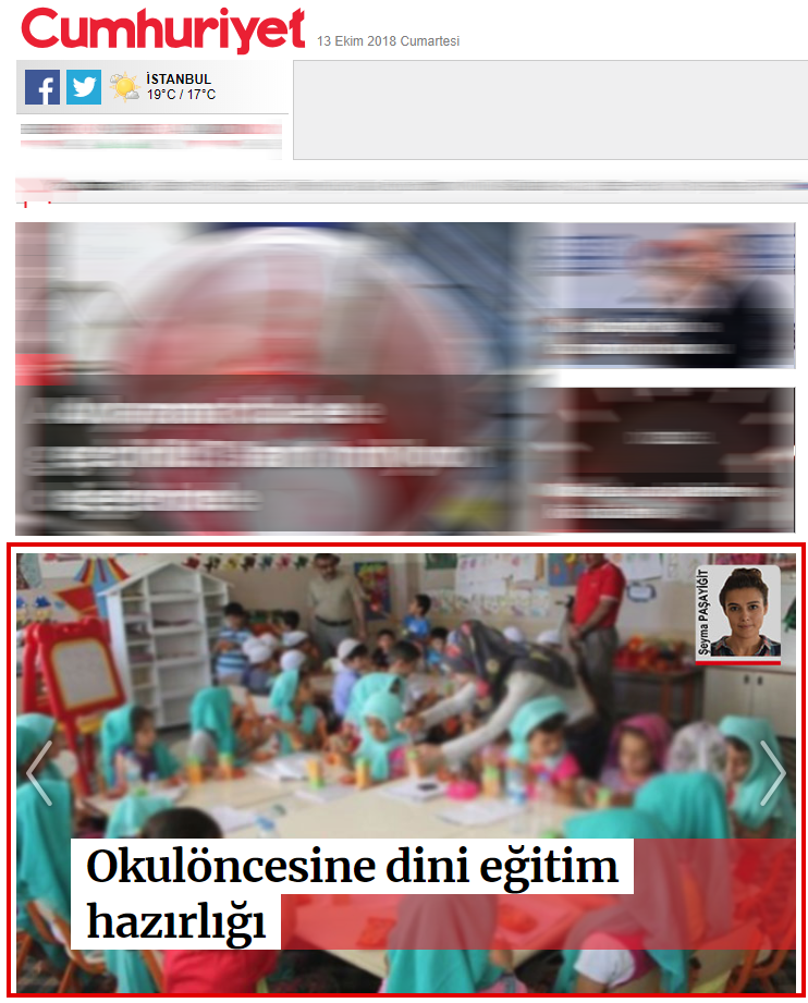 Cumhuriyet’in yönetimi değişti, okurları, “Özüne dönüyor” yorumları yaptı, terör seviciler tasfiye edildi, din düşmanlarına dokunulmadı!.. Terör sevicilerin elinde din düşmanlığı yapan Cumhuriyet, Kemalistlerin idareyi devralmasıyla bu ilkesini bozmadı. Her fırsatta, yalan- yanlış bilgilerle İslam’a, İslam’ı savunanlara ve İslami kurumlara kin kusan kurum, bugün Diyanet’in okul öncesi vermek istediği din eğitimini hedef aldı, çocukların şehadet getirmesinden, dini tabirleri, terimleri öğrenmesinden rahatsız oldu.