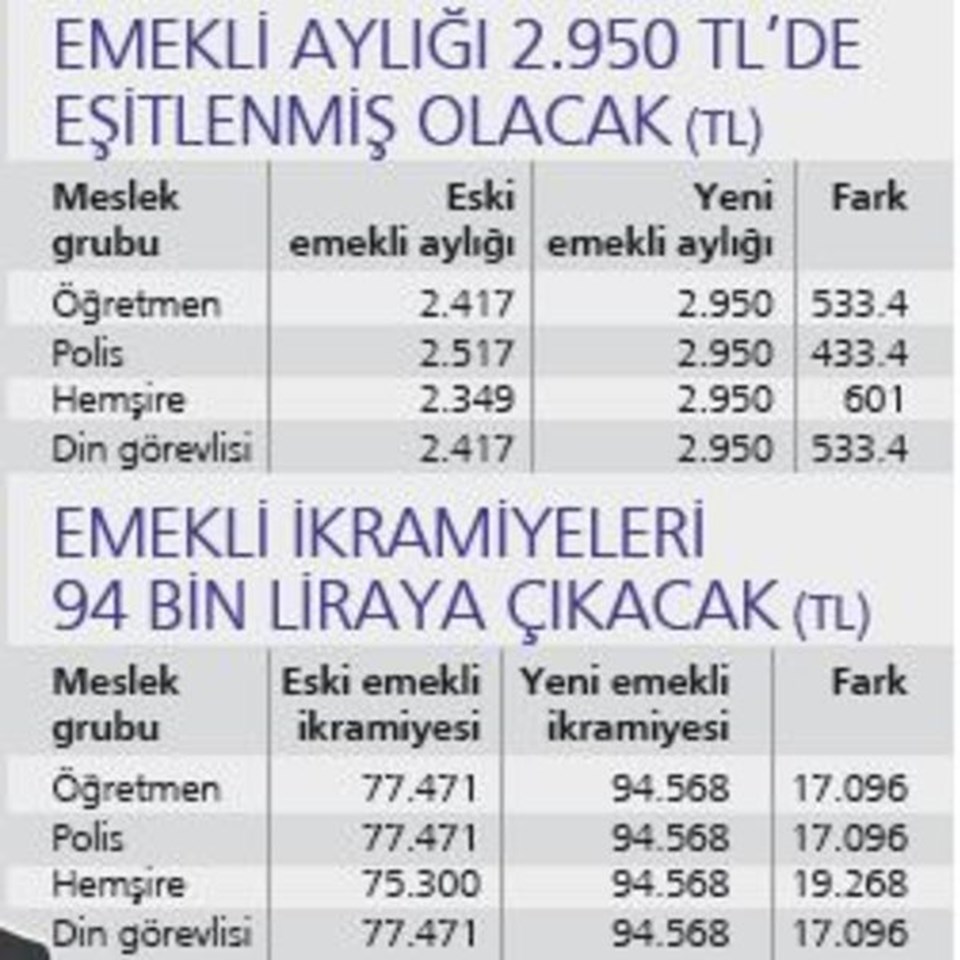 Dört meslek grubunun emekli aylığı, 3000 ek göstergeye tabi olup 25 yıl hizmeti bulunan ve 1/4’ünden emekli olanlar için 2 bin 950 lirada eşitlenecek. Hemşirelerin 2 bin 349 TL olan emekli aylığı 601 TL; öğretmen ve din görevlilerinin 2 bin 417 TL olan emekli aylığı 533 TL; polislerin 2 bin 517 TL olan emekli aylığı da 433 TL artırılacak. 30 yıl hizmeti bulunup ek göstergesi 3000’den 3600’e çıkarılanların emekli aylığındaki artış 641 liraya ulaşacak. 25 yıl hizmeti bulunan ve ek göstergesi 2200’den 3600’e çıkarılanların emekli aylıkları 2 bin 352 liradan 2 bin 950 liraya; 30 yıl hizmeti bulunan ve ek göstergesi 2200’den 3600’e yükseltilenlerin emekli aylıkları da 2 bin 510 liradan 3 bin 147 liraya çıkarılacak.