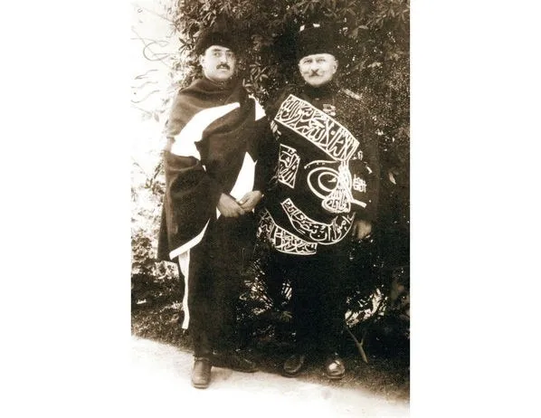 Fahreddin Paşa (sağda) ile Afganistan Kralı Amanullah Han'ın bayraklara bürünerek çektirdikleri fotoğraf.