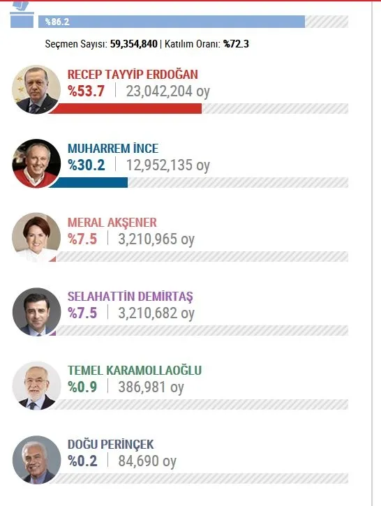 Türkiye yeni yönetim şekli için ilk kez sandığa gitti. 24 Haziran seçimlerinde Cumhurbaşkanı adayları arasında Erdoğan yüzde 50'nin üzerinde oy alarak birinci turda Cumhurbaşkanı olmayı hak kazandı. Cumhurbaşkanı Erdoğan'a yurt içinden ve yurt dışından tebrik telefonları gelmeye başladı.