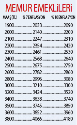 Memur ve memur emeklileri temmuzda % 3.5 zam alacak. Ancak 6 aylık enflasyon % 4’ü aşarsa enflasyon farkı da eklenecek. Örneğin bu farkla oran % 6.5’e yükselirse, zam 128 TL ila 705 TL arasında değişecek. Dün SSK ve Bağ-Kur emeklilerinin alacağı olası zam oranlarını yazmıştık. Bugün de sıra memur ve memur emeklisinde... 1 milyon 442 bin memur emeklisinin maaş zammı, toplu sözleşme görüşmelerinde belirleniyor. Temmuzda memur ve memur emeklilerine yüzde 3.5 zam yapılacak. Ancak temmuzda bir de enflasyon farkı söz konusu olabilir.